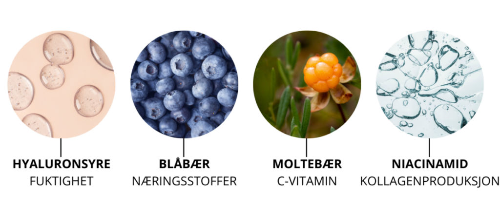 Nordiske blåbær er i sin helt egen liga, når det kommer til næringsstoffer. De små blåsorte bær er propfyldt med vitaminer, kraftige antioxidanter og fedtstoffer. De er især rige på C- og E-vitaminer og antocyaniner, som beskytter huden mod frie radikaler, men indeholder også naturlige fedtstoffer, som trænger godt ind og nærer huden.