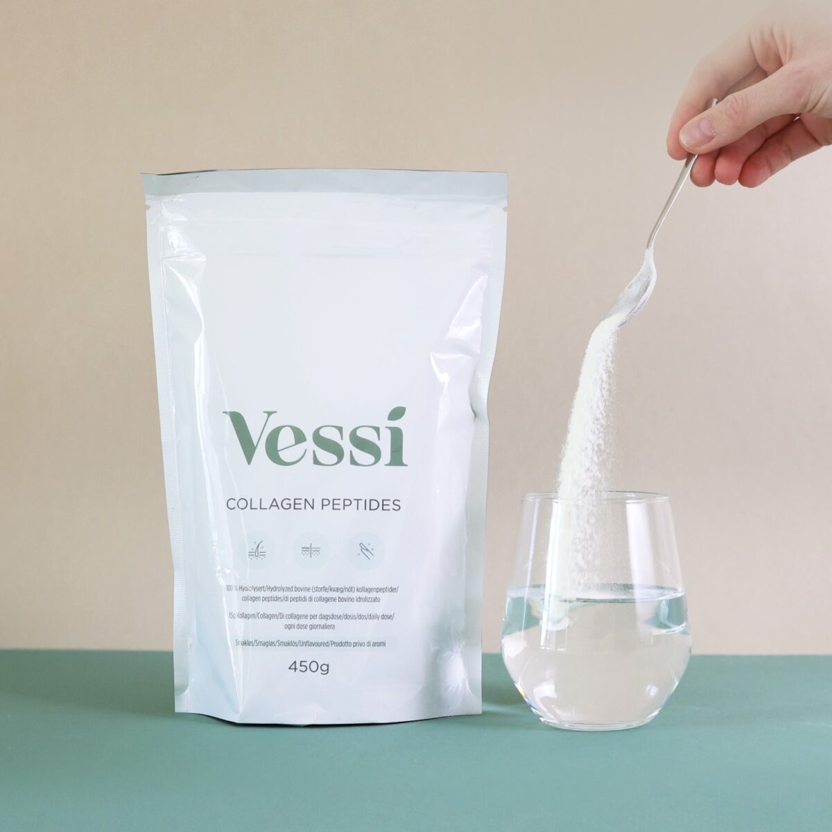 100 % hydrolyserade kollagenpeptider från nöt. Nettoinnehåll: 450 g = 30 portioner